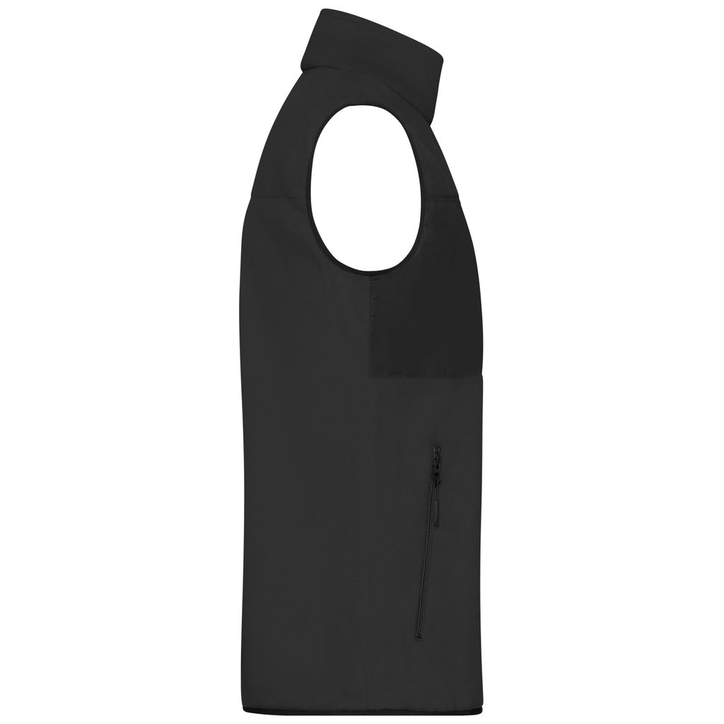 Kényelmes, sportos kialakítású férfi gyapjú mellény újrahasznosított poliészterből. Puha és könnyen mosható. A mellényen mellkasi zseb, 2 cipzáras oldalzseb és 2 belső zseb található. A mellény állógallérral rendelkezik, 2 irányú cipzáras záródással.