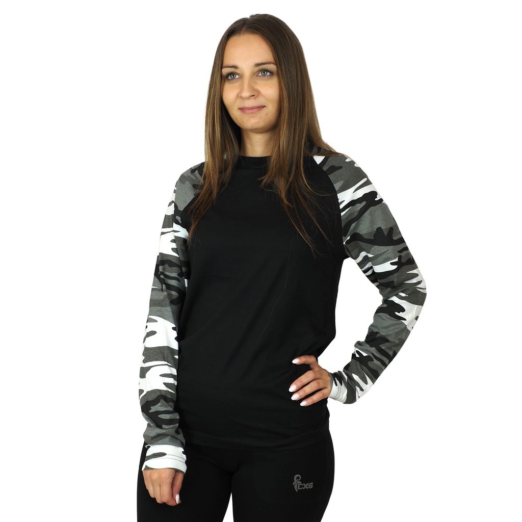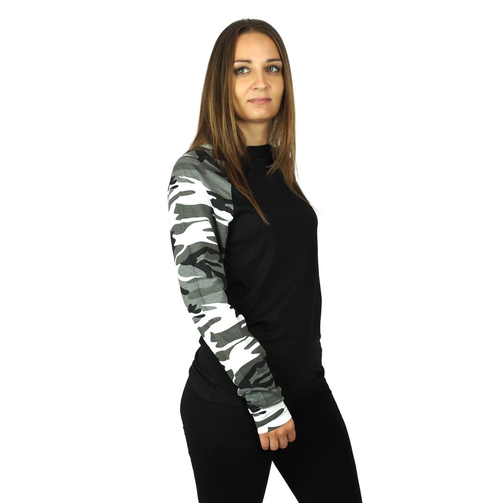Stílusos terepszínű, hosszú ujjú póló, XS-től XXXL-ig méretig. Közepes súlyú, 160 g/m², terep színekkel, raglan ujjakkal. Bordás kötött gallér 5% elasztánnal. Póló oldalsó varratokkal. A nyakpánt belső része szalaggal van megerősítve. 40 °C-on mosható.